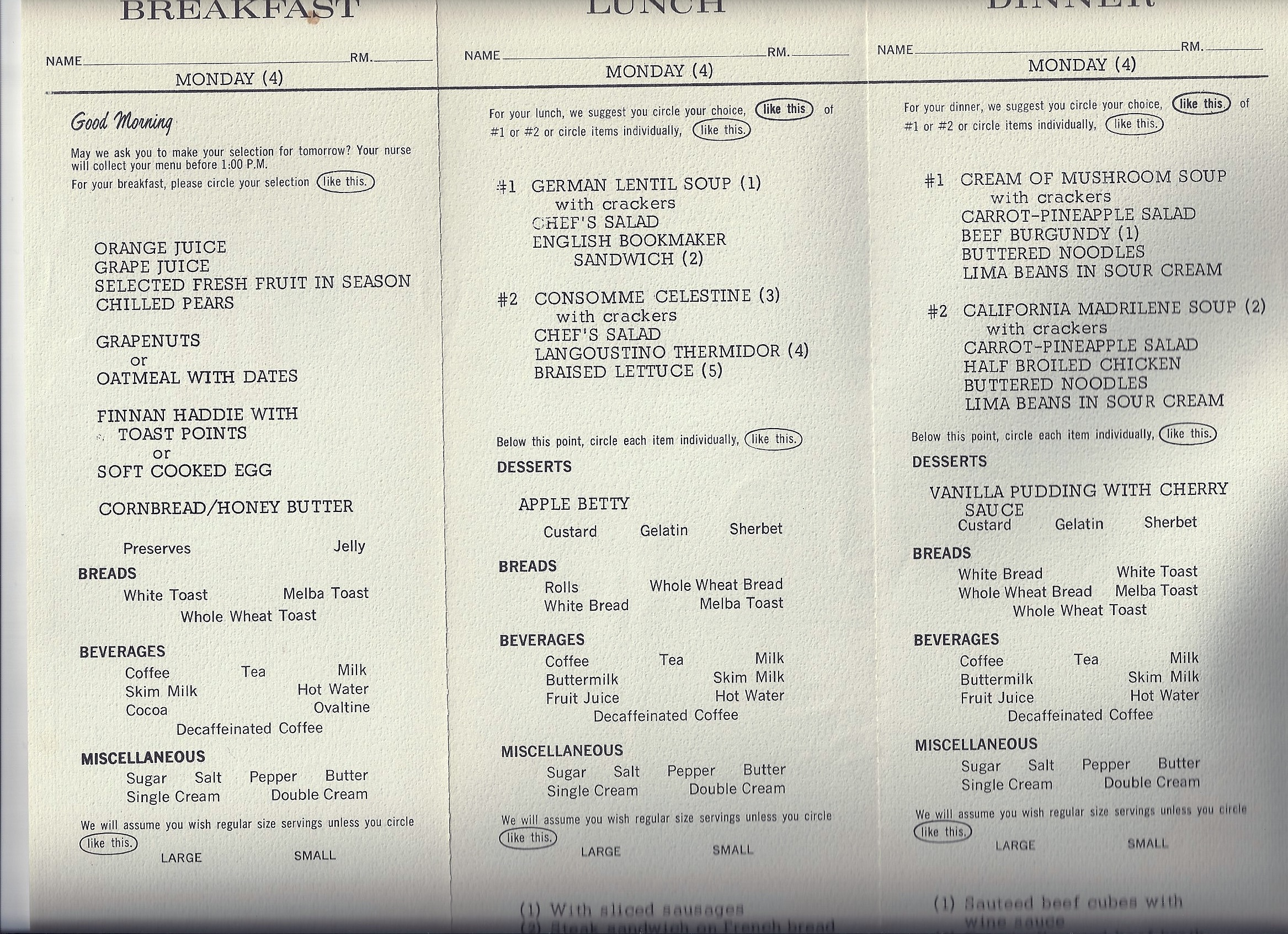 The second document was the Breakfast/Lunch/Dinner menu hospitals give to patients to order their meals. While I think it’s not much of a stretch to say that hospital food hasn’t gotten better over the years, it’s interesting to see what was offered to patients back in the mid ’60s. And from my reading of this menu, it’s a testament to food white people in the U.S. ate. Now, before you get all “What’s all this hating on white people food,” just know that my father (100% Asian Indian) loved, loved, loved this kind of food. I have no idea why, but maybe after living in the U.S. during the ’50s and studying medicine, he grew to like it — because that’s all that was available to him.